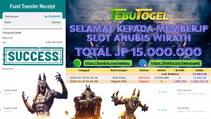Selamat kepada User id : MOMO** telah berhasil mendapatkan kemenangan besar pada permainan SLOT ANUBIS WIRATH dengan kemenangan sebesar Rp 15.000.000,- Setelah mengisi formulir withdraw dengan kurung waktu hanya 5 – 10 menit pihak TebuTogel sudah melakukan transfer kepada pemilik User id dan dana sudah dapat dicairkan oleh pemenang. Bukti pembayaran yang kami berikan merupakan bukti pembayaran yang SAH / VALID yang langung didapatkan melalui tanda transfer transaksi dari Bank yang dituju.
