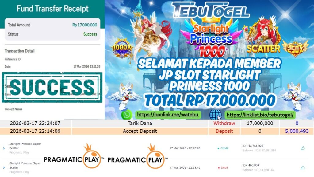 Selamat kepada User id : VIVI** telah berhasil mendapatkan kemenangan besar pada permainan SLOT STARLIGHT PRINCESS 1000 dengan kemenangan sebesar Rp 14.583.000,- Setelah mengisi formulir withdraw dengan kurung waktu hanya 5 – 10 menit pihak TebuTogel sudah melakukan transfer kepada pemilik User id dan dana sudah dapat dicairkan oleh pemenang. Bukti pembayaran yang kami berikan merupakan bukti pembayaran yang SAH / VALID yang langung didapatkan melalui tanda transfer transaksi dari Bank yang dituju.