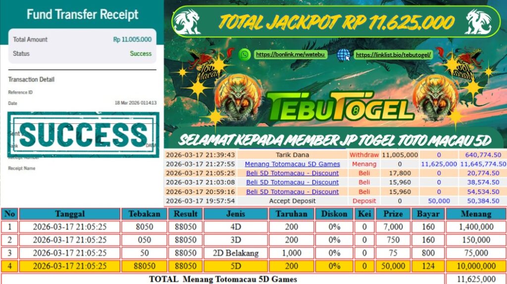 Selamat kepada User id : SHERLY** telah berhasil mendapatkan kemenangan besar pada permainan TOGEL TOTO MACAU 5D dengan kemenangan sebesar Rp 11.625.000,- Setelah mengisi formulir withdraw dengan kurung waktu hanya 5 – 10 menit pihak TebuTogel sudah melakukan transfer kepada pemilik User id dan dana sudah dapat dicairkan oleh pemenang. Bukti pembayaran yang kami berikan merupakan bukti pembayaran yang SAH / VALID yang langung didapatkan melalui tanda transfer transaksi dari Bank yang dituju.