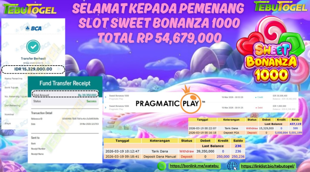 Selamat kepada User id : pulung** telah berhasil mendapatkan kemenangan besar pada permainan SLOT SWEET BONANZA 1000  dengan kemenangan sebesar Rp 54.679.000,- Setelah mengisi formulir withdraw dengan kurung waktu hanya 5 – 10 menit pihak TebuTogel sudah melakukan transfer kepada pemilik User id dan dana sudah dapat dicairkan oleh pemenang. Bukti pembayaran yang kami berikan merupakan bukti pembayaran yang SAH / VALID yang langung didapatkan melalui tanda transfer transaksi dari Bank yang dituju.
