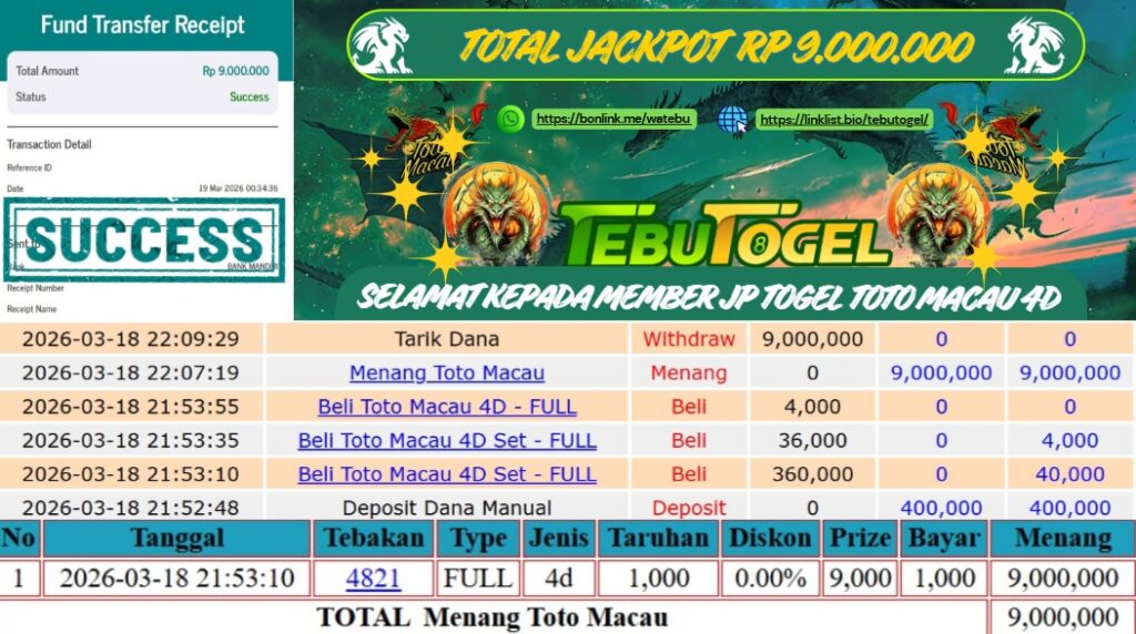 Selamat kepada User id : AUREL** telah berhasil mendapatkan kemenangan besar pada permainan TOGEL TOTO MACAU 4D dengan kemenangan sebesar Rp 9.000.000,- Setelah mengisi formulir withdraw dengan kurung waktu hanya 5 – 10 menit pihak TebuTogel sudah melakukan transfer kepada pemilik User id dan dana sudah dapat dicairkan oleh pemenang. Bukti pembayaran yang kami berikan merupakan bukti pembayaran yang SAH / VALID yang langung didapatkan melalui tanda transfer transaksi dari Bank yang dituju.