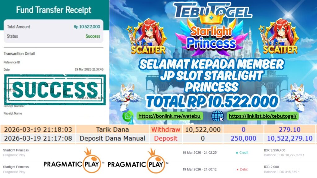Selamat kepada User id : PRATIWI** telah berhasil mendapatkan kemenangan besar pada permainan SLOT STARLIGHT PRINCESS dengan kemenangan sebesar Rp 10.522.000,- Setelah mengisi formulir withdraw dengan kurung waktu hanya 5 – 10 menit pihak TebuTogel sudah melakukan transfer kepada pemilik User id dan dana sudah dapat dicairkan oleh pemenang. Bukti pembayaran yang kami berikan merupakan bukti pembayaran yang SAH / VALID yang langung didapatkan melalui tanda transfer transaksi dari Bank yang dituju.