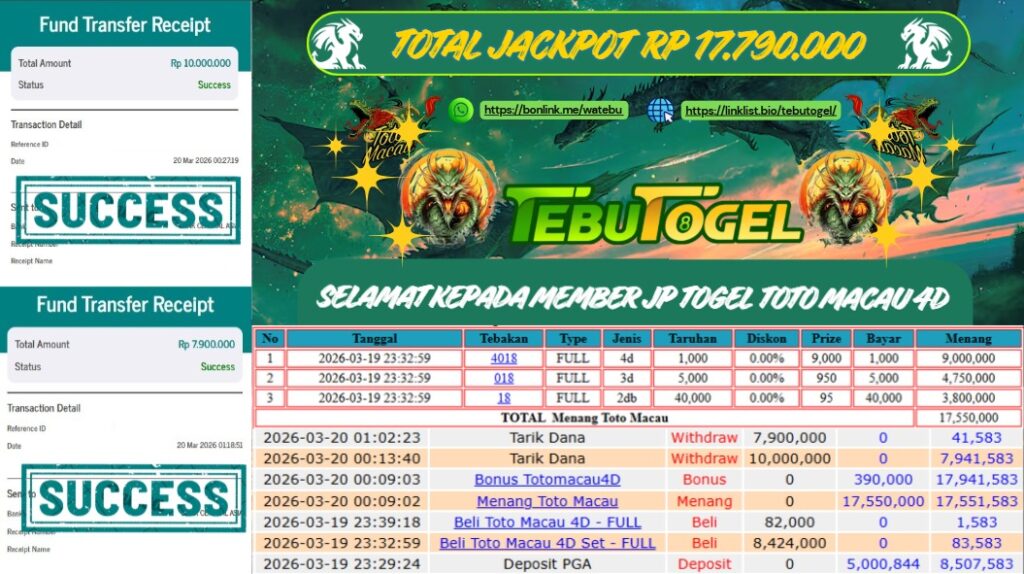 Masih ragu dengan TebuTogel bos ? Dimana bandar togel online sekarang yang terpercaya seperti TebuTogel ? Bandar yang mengirimkan kemenangan member tanpa bertele – tele. Jadi…. tidak perlu khawatir pada situs TebuTogel karena kemenangan anda berapapun akan dibayarkan hingga lunas kepada pemenang.