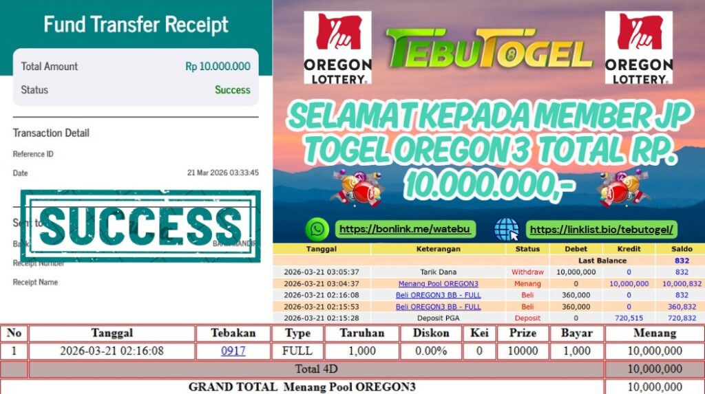 Selamat kepada User id : WULAN** telah berhasil mendapatkan kemenangan besar pada permainan TOGEL OREGON 3 dengan kemenangan sebesar … Baca selengkapnya...