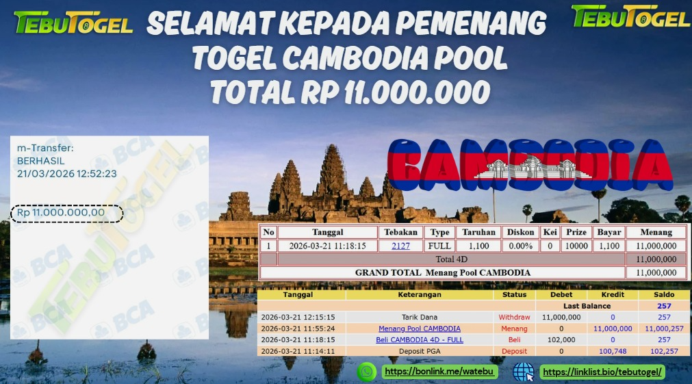 Selamat kepada User id : anam12** telah berhasil mendapatkan kemenangan besar pada permainan TOGEL CAMBODIA POOLS dengan kemenangan sebesar Rp 11.000.000,- Setelah mengisi formulir withdraw dengan kurung waktu hanya 5 – 10 menit pihak TebuTogel sudah melakukan transfer kepada pemilik User id dan dana sudah dapat dicairkan oleh pemenang. Bukti pembayaran yang kami berikan merupakan bukti pembayaran yang SAH / VALID yang langung didapatkan melalui tanda transfer transaksi dari Bank yang dituju.