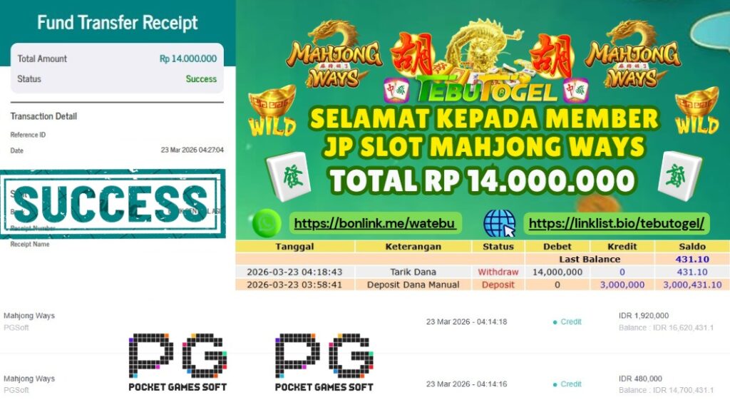 Selamat kepada User id : MANO** telah berhasil mendapatkan kemenangan besar pada permainan SLOT MAHJONG WAYS  dengan kemenangan sebesar Rp 14.000.000,- Setelah mengisi formulir withdraw dengan kurung waktu hanya 5 – 10 menit pihak TebuTogel sudah melakukan transfer kepada pemilik User id dan dana sudah dapat dicairkan oleh pemenang. Bukti pembayaran yang kami berikan merupakan bukti pembayaran yang SAH / VALID yang langung didapatkan melalui tanda transfer transaksi dari Bank yang dituju.