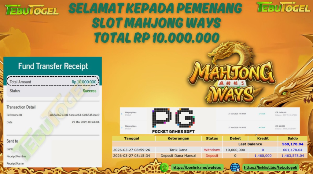 Selamat kepada User id : HENDRA** telah berhasil mendapatkan kemenangan besar pada permainan SLOT MAHJONGWAYS dengan kemenangan sebesar Rp 10.000.000- LUNAS Setelah mengisi formulir withdraw dengan kurung waktu hanya 5 – 10 menit pihak TebuTogel sudah melakukan transfer kepada pemilik User id dan dana sudah dapat dicairkan oleh pemenang. Bukti pembayaran yang kami berikan merupakan bukti pembayaran yang SAH / VALID yang langung didapatkan melalui tanda transfer transaksi dari Bank yang dituju.
