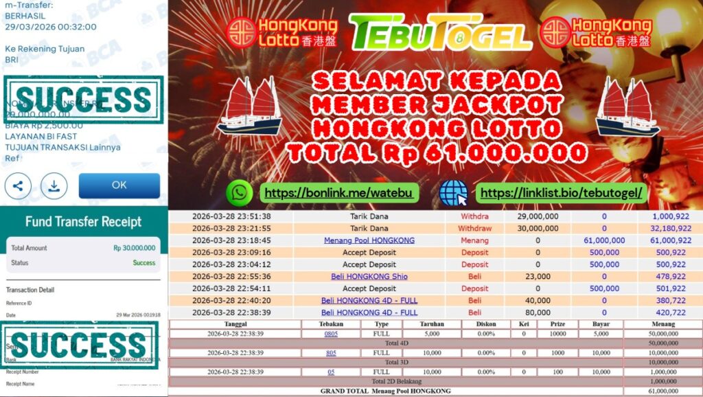 Selamat kepada User id : MECA** telah berhasil mendapatkan kemenangan besar pada permainan TOGEL HONGKONG LOTTO dengan kemenangan sebesar … Baca selengkapnya...