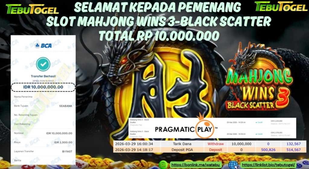 Selamat kepada User id : YUDI** telah berhasil mendapatkan kemenangan besar pada permainan SLOT MAHJONG WINS 3-BLACK SCATETR dengan kemenangan sebesar Rp 10.000.000- LUNAS Setelah mengisi formulir withdraw dengan kurung waktu hanya 5 – 10 menit pihak TebuTogel sudah melakukan transfer kepada pemilik User id dan dana sudah dapat dicairkan oleh pemenang. Bukti pembayaran yang kami berikan merupakan bukti pembayaran yang SAH / VALID yang langung didapatkan melalui tanda transfer transaksi dari Bank yang dituju.