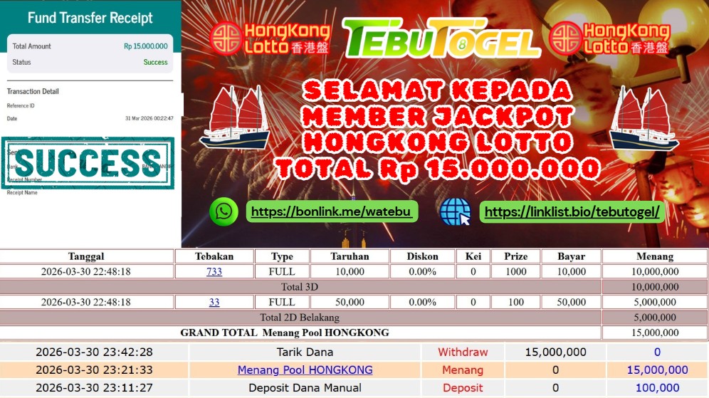 Selamat kepada User id : RUMAH** telah berhasil mendapatkan kemenangan besar pada permainan TOGEL HONGKONG LOTTO dengan kemenangan sebesar … Baca selengkapnya...