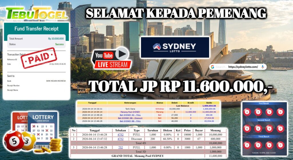 Selamat kepada User id : Bar**** telah berhasil mendapatkan kemenangan besar pada permainan TOGEL SYDNEY LOTTO dengan kemenangan sebesar Rp 11.600.000- LUNAS Setelah mengisi formulir withdraw dengan kurung waktu hanya 5 – 10 menit pihak TebuTogel sudah melakukan transfer kepada pemilik User id dan dana sudah dapat dicairkan oleh pemenang. Bukti pembayaran yang kami berikan merupakan bukti pembayaran yang SAH / VALID yang langung didapatkan melalui tanda transfer transaksi dari Bank yang dituju.