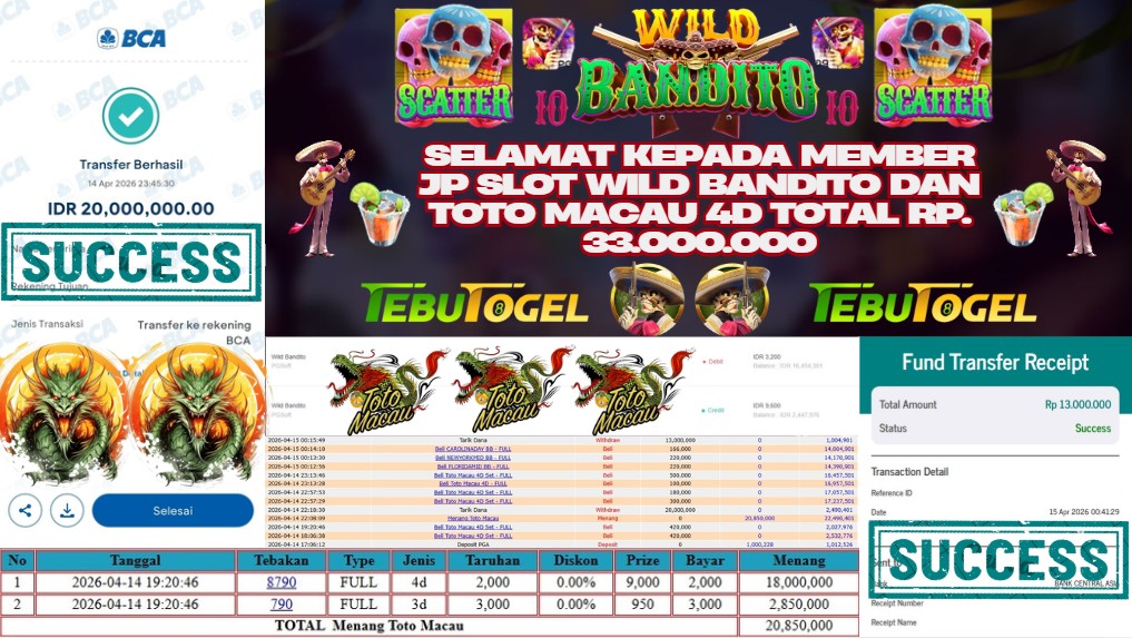Selamat kepada User id : JANA** telah berhasil mendapatkan kemenangan besar pada permainan SLOT WILD BANDITO DAN TOGEL TOTO MACAU 4D dengan kemenangan sebesar Rp 33.000.000- LUNAS Setelah mengisi formulir withdraw dengan kurung waktu hanya 5 – 10 menit pihak TebuTogel sudah melakukan transfer kepada pemilik User id dan dana sudah dapat dicairkan oleh pemenang. Bukti pembayaran yang kami berikan merupakan bukti pembayaran yang SAH / VALID yang langung didapatkan melalui tanda transfer transaksi dari Bank yang dituju.
