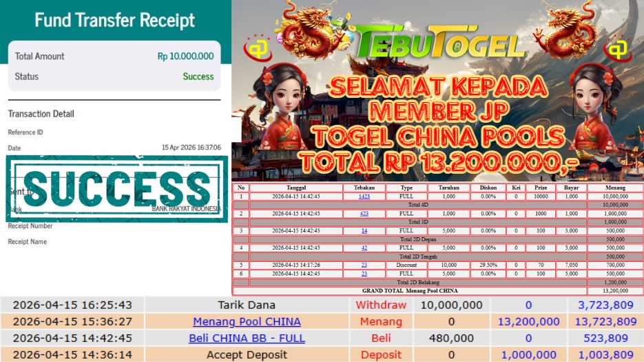 Selamat kepada User id : OWAW** telah berhasil mendapatkan kemenangan besar pada permainan TOGEL CHINA POOLS dengan kemenangan sebesar Rp 13.200.000- LUNAS Setelah mengisi formulir withdraw dengan kurung waktu hanya 5 – 10 menit pihak TebuTogel sudah melakukan transfer kepada pemilik User id dan dana sudah dapat dicairkan oleh pemenang. Bukti pembayaran yang kami berikan merupakan bukti pembayaran yang SAH / VALID yang langung didapatkan melalui tanda transfer transaksi dari Bank yang dituju.