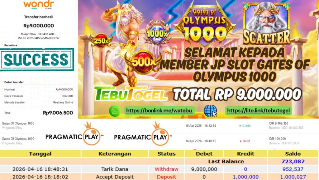 Selamat kepada User id : ROL** telah berhasil mendapatkan kemenangan besar pada permainan SLOT GATES OF OLYMPUS 1000 dengan kemenangan sebesar Rp 9.000.000- LUNAS Setelah mengisi formulir withdraw dengan kurung waktu hanya 5 – 10 menit pihak TebuTogel sudah melakukan transfer kepada pemilik User id dan dana sudah dapat dicairkan oleh pemenang. Bukti pembayaran yang kami berikan merupakan bukti pembayaran yang SAH / VALID yang langung didapatkan melalui tanda transfer transaksi dari Bank yang dituju.