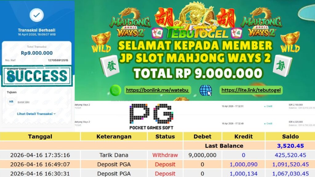 Selamat kepada User id : BETS** telah berhasil mendapatkan kemenangan besar pada permainan SLOT MAHJONG WAYS 2 dengan kemenangan sebesar Rp 9.000.000- LUNAS Setelah mengisi formulir withdraw dengan kurung waktu hanya 5 – 10 menit pihak TebuTogel sudah melakukan transfer kepada pemilik User id dan dana sudah dapat dicairkan oleh pemenang. Bukti pembayaran yang kami berikan merupakan bukti pembayaran yang SAH / VALID yang langung didapatkan melalui tanda transfer transaksi dari Bank yang dituju.