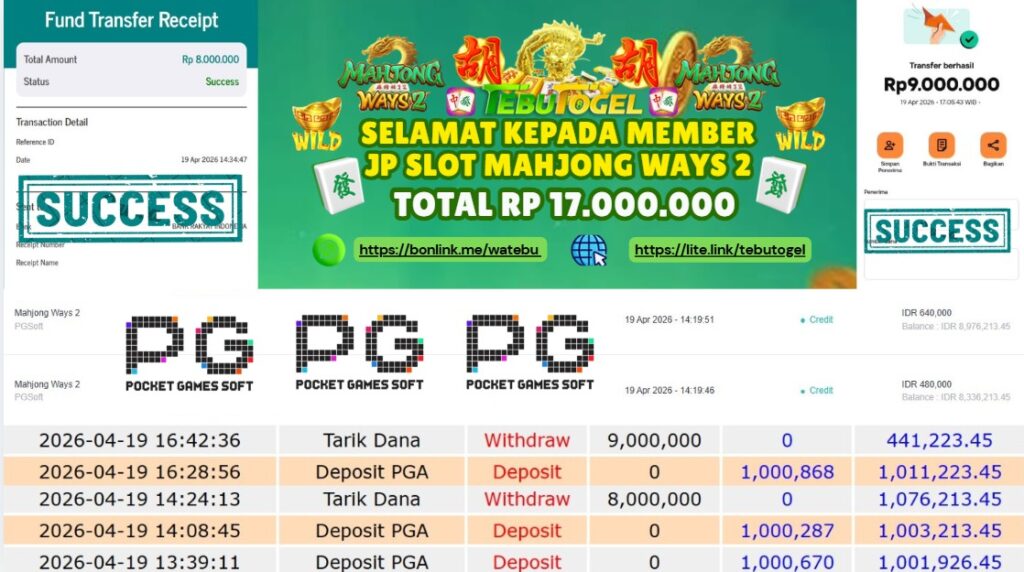 Selamat kepada User id : ARWAH*** telah berhasil mendapatkan kemenangan besar pada permainan SLOT MAHJONG WAYS 2 dengan kemenangan sebesar Rp 17.000.000- LUNAS Setelah mengisi formulir withdraw dengan kurung waktu hanya 5 – 10 menit pihak TebuTogel sudah melakukan transfer kepada pemilik User id dan dana sudah dapat dicairkan oleh pemenang. Bukti pembayaran yang kami berikan merupakan bukti pembayaran yang SAH / VALID yang langung didapatkan melalui tanda transfer transaksi dari Bank yang dituju.
