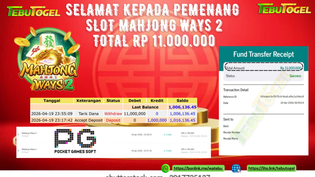 Selamat kepada User id : YUDI*** telah berhasil mendapatkan kemenangan besar pada permainan SLOT MAHJONG WAYS 2 dengan kemenangan sebesar Rp 11.000.000- LUNAS Setelah mengisi formulir withdraw dengan kurung waktu hanya 5 – 10 menit pihak TebuTogel sudah melakukan transfer kepada pemilik User id dan dana sudah dapat dicairkan oleh pemenang. Bukti pembayaran yang kami berikan merupakan bukti pembayaran yang SAH / VALID yang langung didapatkan melalui tanda transfer transaksi dari Bank yang dituju.