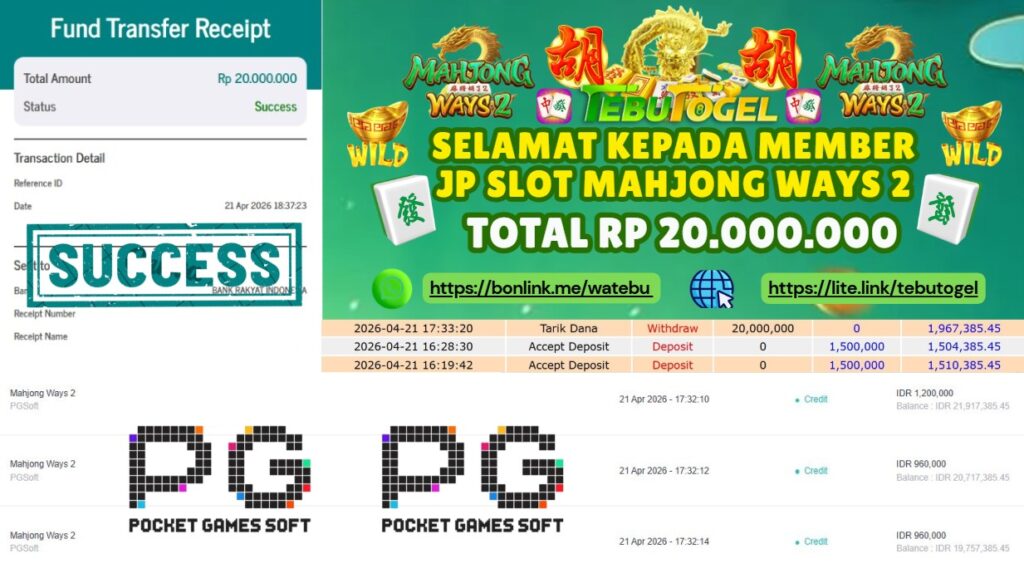 Selamat kepada User id : DINGIN*** telah berhasil mendapatkan kemenangan besar pada permainan SLOT MAHJONG WAYS 2 dengan kemenangan sebesar Rp 20.000.000- LUNAS Setelah mengisi formulir withdraw dengan kurung waktu hanya 5 – 10 menit pihak TebuTogel sudah melakukan transfer kepada pemilik User id dan dana sudah dapat dicairkan oleh pemenang. Bukti pembayaran yang kami berikan merupakan bukti pembayaran yang SAH / VALID yang langung didapatkan melalui tanda transfer transaksi dari Bank yang dituju.