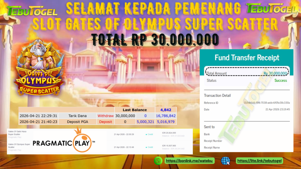 Selamat kepada User id : JEMI*** telah berhasil mendapatkan kemenangan besar pada permainan SLOT GATES OF OLYMPUS SUPER SCATTER dengan kemenangan sebesar Rp 30.000.000- LUNAS Setelah mengisi formulir withdraw dengan kurung waktu hanya 5 – 10 menit pihak TebuTogel sudah melakukan transfer kepada pemilik User id dan dana sudah dapat dicairkan oleh pemenang. Bukti pembayaran yang kami berikan merupakan bukti pembayaran yang SAH / VALID yang langung didapatkan melalui tanda transfer transaksi dari Bank yang dituju.