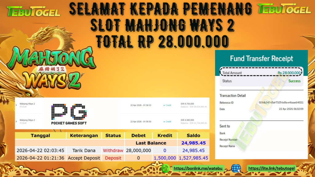 Selamat kepada User id : FACH*** telah berhasil mendapatkan kemenangan besar pada permainan SLOT MAHJONG WAYS 2 dengan kemenangan sebesar Rp 28.000.000- LUNAS Setelah mengisi formulir withdraw dengan kurung waktu hanya 5 – 10 menit pihak TebuTogel sudah melakukan transfer kepada pemilik User id dan dana sudah dapat dicairkan oleh pemenang. Bukti pembayaran yang kami berikan merupakan bukti pembayaran yang SAH / VALID yang langung didapatkan melalui tanda transfer transaksi dari Bank yang dituju.