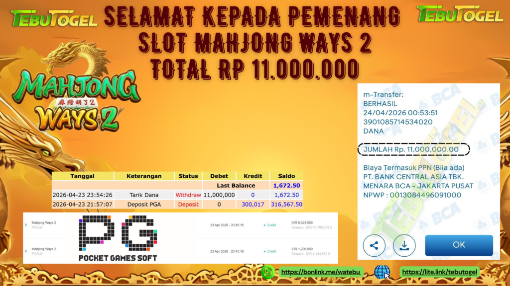Selamat kepada User id : ALZAN*** telah berhasil mendapatkan kemenangan besar pada permainan SLOT MAHJONG WAYS 2 dengan kemenangan sebesar Rp 11.000.000- LUNAS Setelah mengisi formulir withdraw dengan kurung waktu hanya 5 – 10 menit pihak TebuTogel sudah melakukan transfer kepada pemilik User id dan dana sudah dapat dicairkan oleh pemenang. Bukti pembayaran yang kami berikan merupakan bukti pembayaran yang SAH / VALID yang langung didapatkan melalui tanda transfer transaksi dari Bank yang dituju.