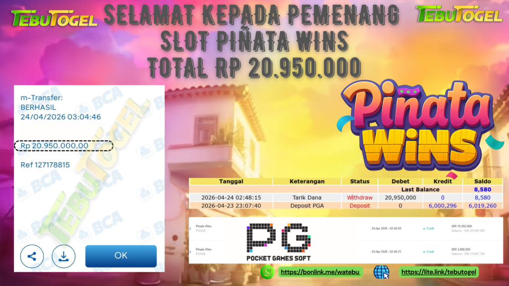 Selamat kepada User id : ALEX*** telah berhasil mendapatkan kemenangan besar pada permainan SLOT Piñata WINS dengan kemenangan sebesar Rp 20.950.000- LUNAS Setelah mengisi formulir withdraw dengan kurung waktu hanya 5 – 10 menit pihak TebuTogel sudah melakukan transfer kepada pemilik User id dan dana sudah dapat dicairkan oleh pemenang. Bukti pembayaran yang kami berikan merupakan bukti pembayaran yang SAH / VALID yang langung didapatkan melalui tanda transfer transaksi dari Bank yang dituju.