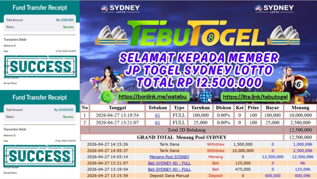 Selamat kepada User id : TRAVEL*** telah berhasil mendapatkan kemenangan besar pada permainan TOGEL SYDNEY LOTTO dengan kemenangan sebesar Rp 12.500.000- LUNAS Setelah mengisi formulir withdraw dengan kurung waktu hanya 5 – 10 menit pihak TebuTogel sudah melakukan transfer kepada pemilik User id dan dana sudah dapat dicairkan oleh pemenang. Bukti pembayaran yang kami berikan merupakan bukti pembayaran yang SAH / VALID yang langung didapatkan melalui tanda transfer transaksi dari Bank yang dituju.
