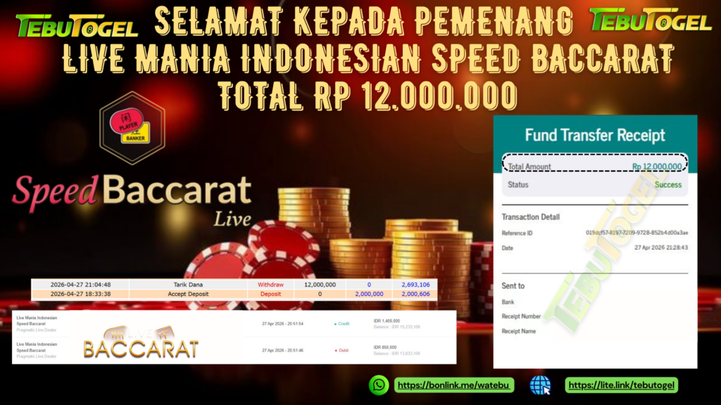 Selamat kepada User id : GIFAAR*** telah berhasil mendapatkan kemenangan besar pada permainan LIVE GAME MANIA INDONESIAN BACCARAT dengan kemenangan sebesar Rp 12.000.000- LUNAS Setelah mengisi formulir withdraw dengan kurung waktu hanya 5 – 10 menit pihak TebuTogel sudah melakukan transfer kepada pemilik User id dan dana sudah dapat dicairkan oleh pemenang. Bukti pembayaran yang kami berikan merupakan bukti pembayaran yang SAH / VALID yang langung didapatkan melalui tanda transfer transaksi dari Bank yang dituju.