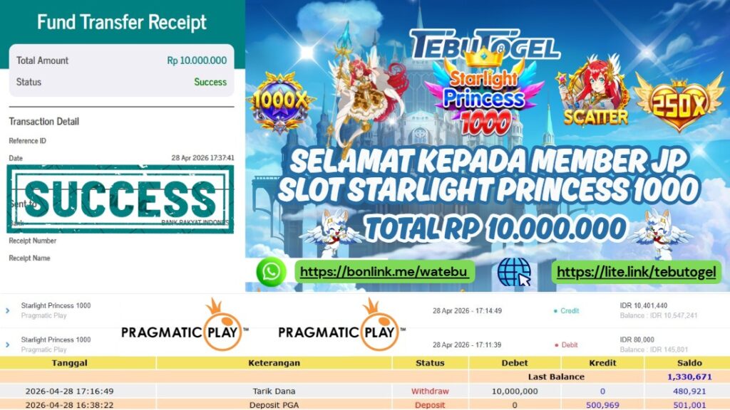 Selamat kepada User id : LOCKDOWN** telah berhasil mendapatkan kemenangan besar pada permainan SLOT STARLIGHT PRINCESS 1000 dengan kemenangan sebesar Rp 10.000.000- LUNAS Setelah mengisi formulir withdraw dengan kurung waktu hanya 5 – 10 menit pihak TebuTogel sudah melakukan transfer kepada pemilik User id dan dana sudah dapat dicairkan oleh pemenang. Bukti pembayaran yang kami berikan merupakan bukti pembayaran yang SAH / VALID yang langung didapatkan melalui tanda transfer transaksi dari Bank yang dituju.