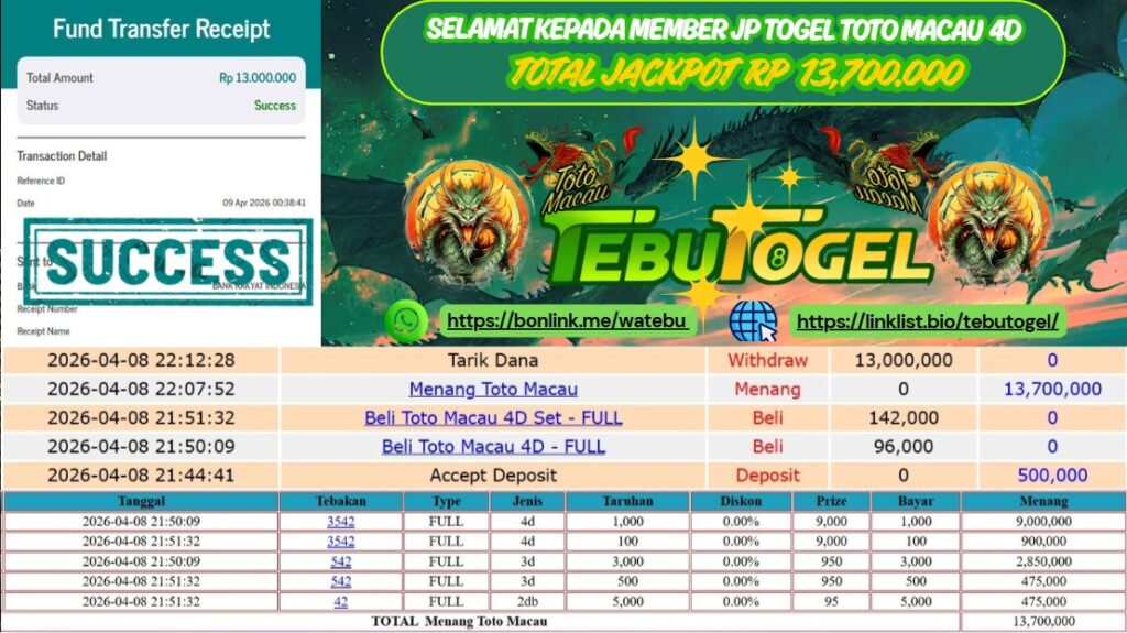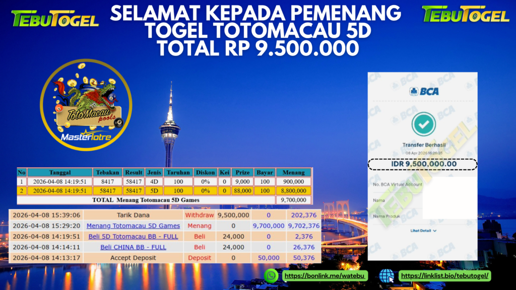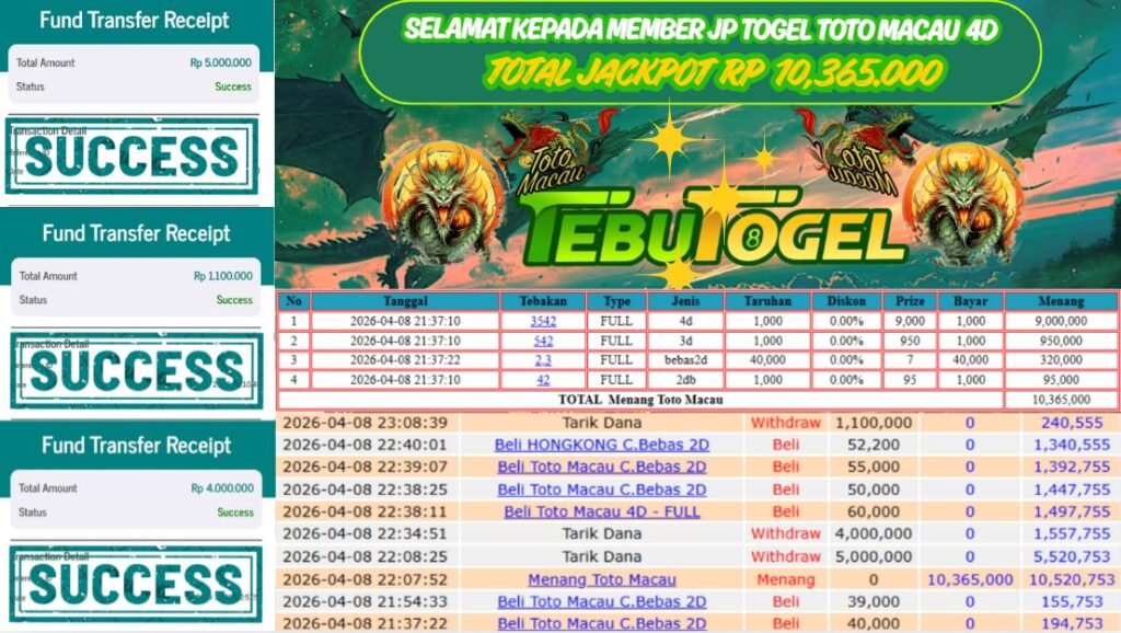 Selamat kepada User id : AZH** telah berhasil mendapatkan kemenangan besar pada permainan TOGEL TOTOMACAU 5D dengan kemenangan sebesar Rp … Baca selengkapnya...