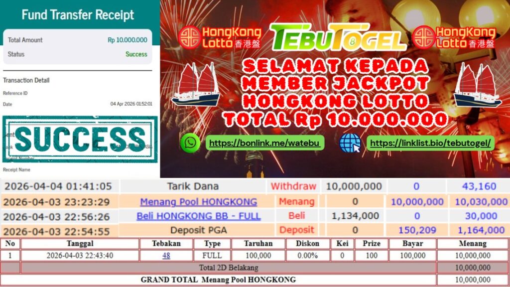 Selamat kepada User id : MOYA** telah berhasil mendapatkan kemenangan besar pada permainan TOGEL HONGKONG LOTTO dengan kemenangan sebesar … Baca selengkapnya...