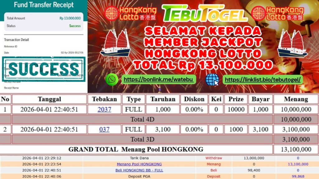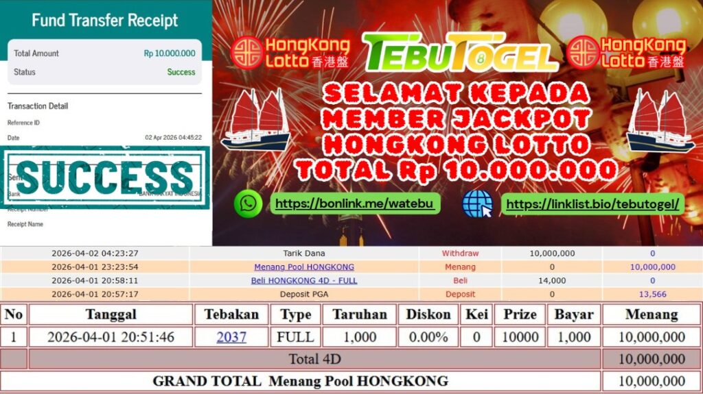 Selamat kepada User id : BONITA** telah berhasil mendapatkan kemenangan besar pada permainan TOGEL HONGKONG LOTTO dengan kemenangan sebesar … Baca selengkapnya...