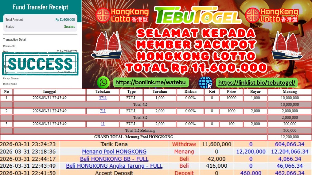 BUKTI JACKPOT TOGEL HONGKONG LOTTO Rp 11.600.000- LUNAS